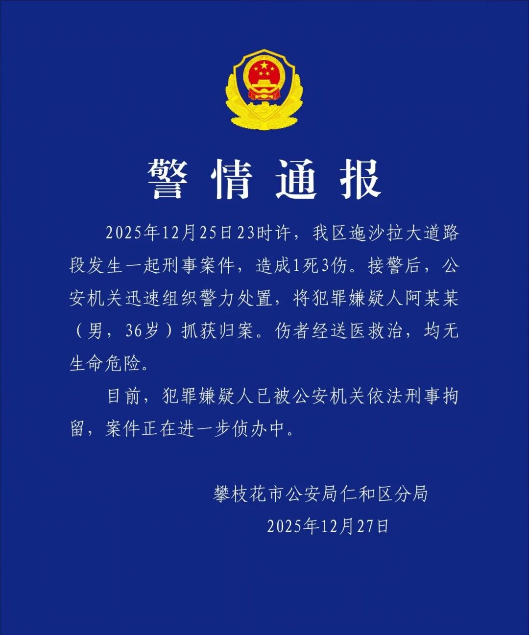 2025年12月25日23时许,我区迤沙拉大道路段发生一起刑事案件,造成1死3伤。接警后,公安机关迅速组织警力处置,将犯罪嫌疑人阿某某(男,36岁)抓获归案。伤者经送医救治,均无生命危险。