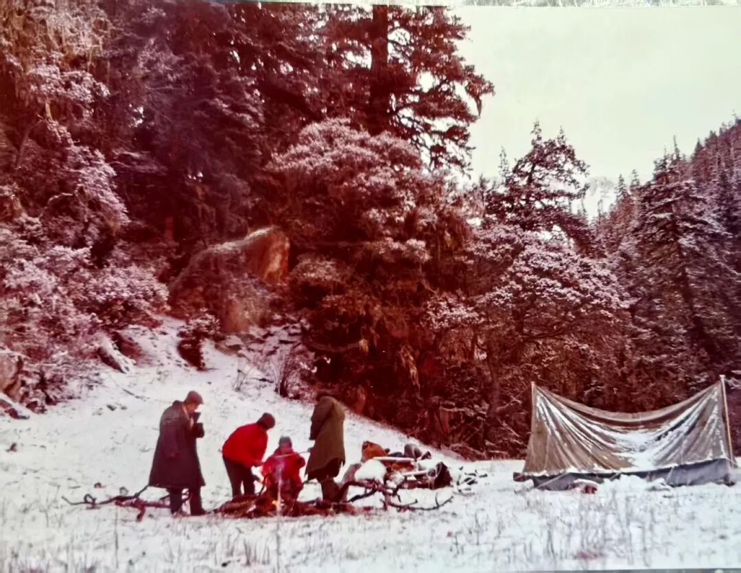 赴叶巴途中,何平(左)、颜柯在雪地燃起篝火准备宿营(张国宪 供图)